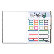 “Perfect-binding” feature allows notebook to lie flat when open. Oversized hardbound leather-look cover. Includes adhesive labels to customize tabs.
