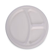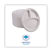 Boardwalk Bagasse Dinnerware, 3-Compartment Plate, 10" dia, White, 500/Carton