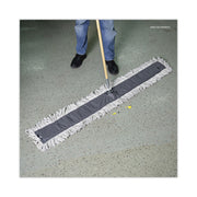 Four-ply, pretreated yarn, dust mop head. Equipped with a slot pocket backing which allows a metal dust mop frame to slide into its place quickly and easily. Sewn center fringe for added coverage and durability. The disposable head can be discarded when dirty. Ideal for use on floors that require dusting, with or without cleaning spray. Handle and frame are sold separately.