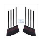 Convenient size janitorial or housekeeping broom for light-duty sweeping. Stiff, tightly packed bristles get into nooks and crannies while pushing dust and debris. Composed of a wooden handle with flagged-tip, polypropylene bristles for added durability. The four rows of stitching and metal wrapping provided strength and dependability. Black color blends seamlessly into contemporary environments. Lightweight and portable for added mobility. Great for hotels, restaurants, lobbies, and household sweeping on a variety of floor types.