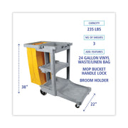 Roomy janitor’s cart makes it easy to transport mop buckets, cleaning supplies, restroom stock, housekeeping essentials, and more. Molded-in tool hooks keep mops, brooms, and extension wands upright and ready for use. Easy-to-clean durable vinyl bag lifts up and is ideal for either waste or linen collection. Vinyl bag attaches to hooks along the inside of the janitor's cart for easy installation. Metal pressure bars are available (sold separately) for the vinyl bag for a more secure fit. High-impact polyethylene withstands the rigors of heavy use. Two 3" swivel casters and two 8" wheels make it extremely mobile for getting around tight spaces on various surfaces.
