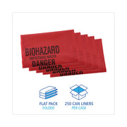 Linear, low-density, high-visibility, bright red medical waste can liners are designed specifically for biohazard materials in health care settings. A high-quality, blended resin can liner that’s constructed with puncture and tear resistance for added strength and durability. Biohazard warnings printed in English and Spanish. Meets DOT requirements. Provides trusted trash collection for wet or dry hazardous waste at an economical price. Individually folded for quick and easy dispensing.