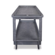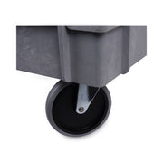 Durable resin construction, gray, two-shelf utility cart with casters. Molded-in plastic handle allows for easy steering on the go. The handle and raised top rim are great for hanging cleaning products and supplies to tackle cleaning jobs from one room to the next. Convenient swivel casters allow multi-directional travel around tight corners. Two fixed shelves provide sturdy storage for all your janitorial supplies.