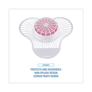 Boardwalk® Urinal Screen with Para Deodorizer Block cleans, protects, sanitizes, and deodorizes to keep the urinal clean and smelling fresh. Constructed with a pliable, plastic screen that helps to traps debris. Reduces odor causing bacteria, which protects the drain. Built with a durable, non-splash design. Para deodorizer kills odor-causing bacteria and disinfects. Lasts up to 30 days with a cherry scent.