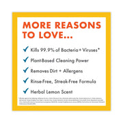 Multitasking at its best! This disinfectant cleans, deodorizes and disinfects in one easy step. No need to rinse, even on food contact surfaces and children's toys. Ready-to-use formula requires no mixing. The active ingredient Thymol kills cold and flu viruses on hard, non-porous surfaces and eliminates 99.9% of household germs and allergens. It dries streak-free and leaves no residue. Free from harsh chemicals, this plant-powered lemon scented formula is safe to use around kids and pets.