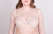 A classic bra made from elastic fabric and knit fabric. The upper part of the cup features an insert made of elastic lace fabric. This underwired model has soft cups with double segmentation, a side shaping detail, and wide straps. It utilizes a four-row closure, allowing for perfect adjustment of the bra's volume. The width of the straps and closure varies depending on the bra size. The bra is embellished with a pendant.