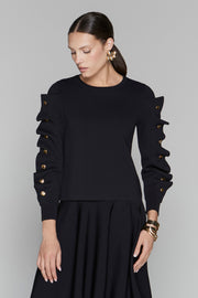 The Branson Top features a refined knit fabric with a classic crew neck, enhanced by elegant ruffle sleeves adorned with gold buttons. This sophisticated design offers a polished look perfect for elevating your wardrobe with subtle yet striking details.