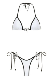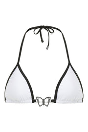 Introducing a stunning Brickell Chic Bikini Top that seamlessly blends elegance with playful charm. This chic piece features a crisp white base accentuated by a striking black contrasting border, creating a modern and sophisticated look. The clean lines and classic color combination make it a versatile addition to your swimwear collection, perfect for both beach outings and poolside lounging.