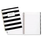 Durable hardcover notebook is designed for daily use, with classic black-and-white striped cover and gold accents. Ruled pages keep handwriting neatly aligned and include a date box for added convenience. Each page is perforated for clean and easy removal. Notebook is wirebound with gold twinwire binding to add style. The black-and-white striped notebook is bold and classy with a front cover that features the word “notes" stamped in gold along with the Cambridge® brand name. High quality white paper with black ruling meets all your notetaking needs.