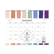 Calendar has a painted stripe design and runs 12 months from January to December. One month per page format has unruled daily blocks for open scheduling. Past and future reference calendars are displayed on each page for quick date checking. Silver twin-wire binding keeps pages secure and has a built-in hanging loop for easy wall display.