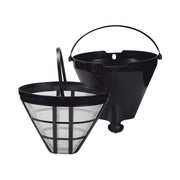 Brews 12 cups. Euro look with stainless steel. Swing-out filter basket holder with cone filter. Features programmable controls, pause function and automatic shut-off. Water level sight glass. Includes decanter. Hidden storage for grounded commercial cord.