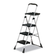 Lightweight yet durable steel work platform has three large heavy-duty polypropylene resin steps with slip-resistant treads and a large 14 3/4w x 12d top platform step. Handy molded utility tray holds tools, paint cans and wallpaper rolls. Extended hand-grip handle with tool holder. With non-marring, skid-resistant feet to provide stability and protect floor surfaces and easy one-hand fold and lock release. Select ladder of proper duty rating to support combined weight of user and materials. WARNING: Metal ladders conduct electricity. Do not use where contact may be made with live electrical circuits.