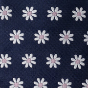 Woven white daisy motifs create the scattered dot design on this navy men's tie. Features a basket weave stitch. Our tie will maintain its shape and hold a perfect knot thanks to the durable yet soft 100% Silk. A perfect tie for Spring and can be worn for casual events or to bring a fresh vibe to the office.
