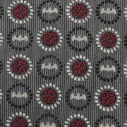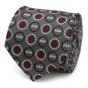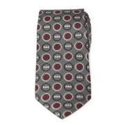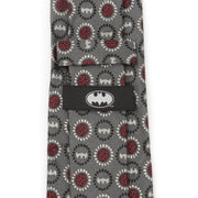 Round medallions of crimson red and gunmetal gray form a decorative pattern on this 100% silk tie. Featuring discrete Batman symbols on a charcoal background, this tie will earn you a knowing nod from fellow Dark Knight fans at every formal event you attend. Officially licensed by DC Comics.