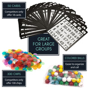 A colorful, upgraded Bingo set that plays up to 50 players at once. Great for seasoned Bingo veterans who like to play multiple cards per round.