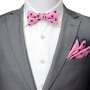 It's time to bring some color and fun to your wardrobe with this Disney bow tie. Deep navy Mickey Mouse icons and pin dots have been set against a rich pink background, making it bright, colorful, and perfect for spring or summer weddings or to liven up the boardroom. Experience enchantment with our expertly crafted 100% Silk bow tie. It's built to last, infused with Disney magic, and ready to accompany you on whimsical adventures. Wear alone or pair with our matching pocket square to complete your look. Officially licensed by Disney.