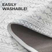 Refresh your home with a practical and charming machine washable rug, showcasing a white and grey distressed tribal print. This rug seamlessly complements your decor while keeping up with the daily demands of a busy life. It's sturdy and perfect for active households with children and pets. With this rug being low-pile, you can add it to any space in your home to create an inviting, clean, and stylish area. The innovative design ensures easy cleaning and upkeep, providing a stress-free way to maintain a fresh and inviting atmosphere in your living space.
