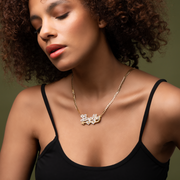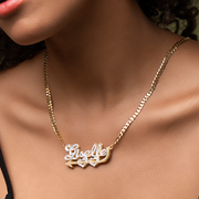 Our popular Double Plated Cupid's Love Name Necklace boasts a chic and elegant design, handcrafted to perfection. The model showcases the necklace with an 18-inch Cuban chain (see video for reference).