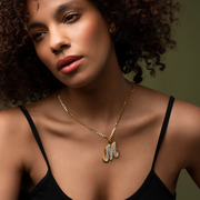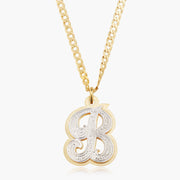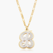 Our popular Double Plated Iced Out Initial Necklace boasts a chic and elegant design, handcrafted to perfection. The model showcases the necklace with an 18-inch Figaro chain (see video for reference).