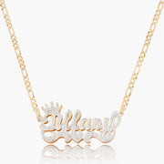 Our popular Double Plated Iced Princess Crown Name Necklace boasts a chic and elegant design, handcrafted to perfection. The model showcases the necklace with an 18-inch Cuban chain (see video for reference).