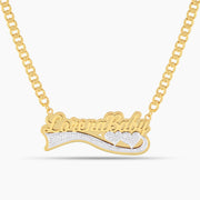 The Double Plated Love Curve Name Necklace features a romantic script design with a sweeping curve and heart detail. Its bold, layered finish adds a touch of shine and sentiment to your everyday look.
