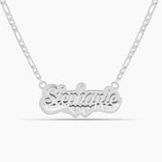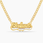 The Double Plated LoveTail Nameplate features elegant script layered over a flowing tail design with a delicate heart accent. A bold, romantic piece made to showcase your name with flair and charm.