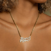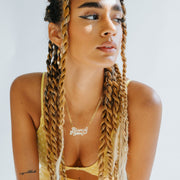 Our popular Double Plated Star Name Necklace boasts a chic and elegant design, handcrafted to perfection. The model showcases the necklace with a 16-inch Cuban chain (see video for reference).