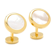 Our Double Sided Gold Mother of Pearl Stud Set is perfect for that special occasion. A round beveled edge of gold plated base metal borders Mother of Pearl for a sophisticated look. The details continue to the back of the cufflinks where the fixed backing closure features the same beveled edge around an Onyx center. The studs have the same round beveled shape and are double sided to be worn with either the Mother of Pearl or Onyx showing, or if you're feeling adventurous, you can alternate in color. Our cufflinks will stand up to wear and maintain their sleek look thanks to being crafted from durable base metal.