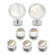 The Double Sided Mother of Pearl Stud Set is perfect for that special occiasion. A round beveled edge of silver plated base metal borders Mother of Pearl stone for a sophisticated look. The details continue to the back of the cufflinks, where the fixed backing closure features the same beveled edge around an Onyx center. The studs have the same round beveled shape, and are double sided to be worn with either the Mother of Pearl or Onyx showing, or if you're feeling adventurous, you can alternate in color.