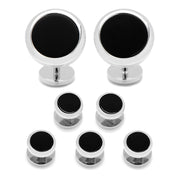 The Double Sided Onyx Stud Set is perfect for that special occasion. A round beveled edge of plated base metal borders Onyx stone for a sophisticated look. The details continue to the back of the cufflinks, where the fixed backing closure features the same beveled edge around a Mother of Pearl center. The studs have the same round beveled shape, and are double sided to be worn with either the Mother of Pearl or Onyx showing, or if you're feeling adventurous, you can alternate in color.