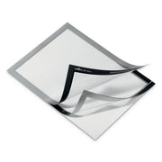 Self-adhering display sign with hinged magnetic front lets you create professional looking signage/displays quickly and easily. Adheres to any smooth and solid surface. Simply peel, stick and you're done. Sturdy cover lifts effortlessly, allowing for speedy insert updates. Magnetic seal holds inserts securely in place. Can be read from both sides when affixed to transparent surfaces, such as glass. Frame looks identical from both sides. Can be used in both portrait and landscape formats.