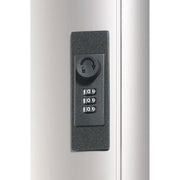 Elegant brushed aluminum key drop and storage cabinet with numeric combination lock. Returned keys drop into lid slot in locked cabinet and are contained in a large interior return bin which swings out for easy access. The easy-to-read snap open/shut key tag window clearly identifies keys and permits tags to be quickly updated as needed. Height adjustable key rails. Key drop holds 30 keys; storage cabinet holds 54 keys. Includes starter set of six key tags. Additional tags sold separately. Mounting hardware included.