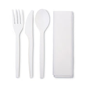 Includes knife, fork, spoon and single-ply napkin. Strong and heat tolerant cutlery in one handy kit. Kit wrapper made with polypropylene.