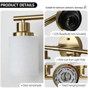 The warm gold finish and frosted glass shades provide soft, flattering illumination, perfect for modern or classic bathrooms.