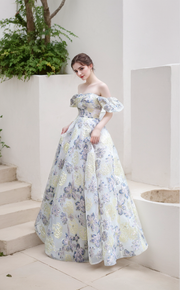 Elora - embroidery golden blue floral pattern off-the-shoulder Princess Prom Dress