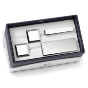 A classic, clean look for a classic gent. Add the engraving of your choice to this stainless steel set, featuring a set of cufflinks, tie bar, and money clip. Please note that all engravings will be exactly as entered on the order. For monogram styles, the middle letter ordered will be enlarged and centered.
