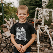 "Enter If You Dare" with this spooky haunted house design! It's a perfect nod to vintage Halloween with a creepy-crawly feel. This design is perfect for anyone who loves a good thrill and wants to show off their spooky style.