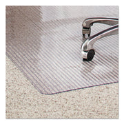 Beautiful crystal clear chair mat features innovative linear design for greater comfort and a smoother glide. Experience an exceptional mat engineered for all day support. Micro cleats secure the mat firmly in place. Premium mat protects carpets up to 3/4" thick including padding. Straight edge.