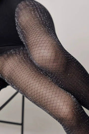 SILVER tights with shimmering honeycomb lace pattern are made to catch the eye and elevate any casual or evening outfit with a unique touch.