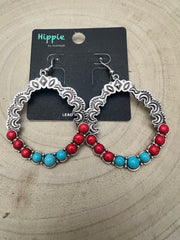 These Faux Turquoise and Coral Hoop Earrings feature a 1 3/4 inch drop, perfectly capturing a classic Western style. The vibrant faux turquoise and coral stones add a pop of color that complements any outfit, from casual denim to your favorite cowboy boots.