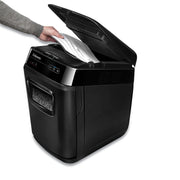 This shredder can automatically shred up to 200 sheets of paper with the touch of a button or manually shred up to 10 sheets into 2154 (5/64" x 35/64"; security level P-5) micro-cut particles. This machine also safely shreds credit cards and staples. It is equipped with Accufeed™ Technology providing fast automatic shredding for increased productivity. Simply load the drawer, push the button and walk away. For jam prevention, this machine uses auto reverse technology which automatically stops and reverses the paper if a jam occurs. Also, the SilentShred™ Technology and energy saving sleep mode system allow this machine to integrate easily to any environment. With the ability to shred for up to 25 minutes before a cool down period is needed, it is ideal for personal deskside use and includes an 8.5-gallon pull-out bin.