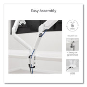 Two fully independent adjustable monitor arms with innovative gas spring technology allows for effortless monitor adjustment. Intuitive cord management system helps minimize clutter. Two 3.0 USB ports located at the base of the product make it easy to connect to your favorite devices. Easy to mount – can be mounted via clamp on desks between 0.8" and 4.7" thick or grommet hole between 0.3" and 2.9". Each arm holds a monitor up to 20 lbs.