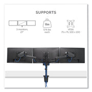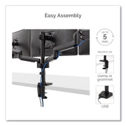 Three fully independent adjustable monitor arms with innovative gas spring technology allows for effortless monitor adjustment. Intuitive cord management system helps minimize clutter. Two 3.0 USB ports located at the base of the product make it easy to connect to your favorite devices. Easy to mount – can be mounted via clamp on desks between 0.8" and 4.7" thick or grommet hole between 0.3" and 2.9". Each arm holds a monitor up to 20 lbs.