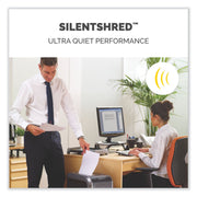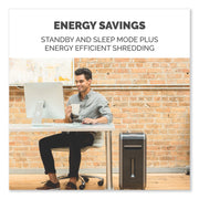 Provides powerful professional shredding with jam protection. The 100% Jam Proof System eliminates paper jams and powers through tough jobs. SafeSense® Technology stops shredding when hands touch the paper opening. SilentShred™ offers ultra-quiet performance for shared workspaces. Energy Savings System provides optimal energy efficiency 100% of the time-in use and out of use. Shreds 18 sheets per pass into 5/32” x 1 1/2” cross-cut particles (Security Level P-4), and has a 9-gallon pull-out bin. Maximum run time: 30 on/40 off. For 1-3 users.