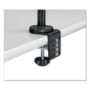 Features two monitor arms that adjust easily in every way. Easy to mount--clamp attaches to desktops 1" to 3" thick or through grommet holes at least 3 1/4” in diameter. Elevates LCD monitors from 3 1/2" to 16 1/2" above the desk with a reach of 2 1/2"-27". Tilts up or down +/- 37 degrees and freely swings left or right (360° rotation capability). Each arm holds an LCD monitor up to 24 lbs. Meets VESA mounting standards.