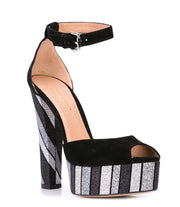 Description: The Madison Maison Festa Black Suede Venezia Platform Heel is a 6 inch peep-toe heel, perfect for a night out. The Handmade Leather heel is comfortable, and the high-quality glitter finish paired with the suede make for a one-of-a-kind design.