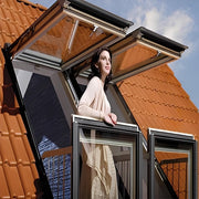 An innovative, large roof window, in which the sashes create a functional balcony in the loft. The upper sash is opened steplessly upwards. The bottom sash tilts forwards to a vertical position, allowing free access to the balcony recess. It is enough to take a few steps in order to get “outside” and feel the warmth of the sun rays, refreshing breeze or admire beautiful views. The upper sash is opened steplessly upwards, up to an angle of 45°. The side rails are integrated into the bottom sash and extend during its opening. When the lower sash is closed, the balcony rails hide inside the window and are not visible above the roof surface. They are concealed under the window flashing, hence do not collect dirt or spoil aesthetic appearance of the roof.