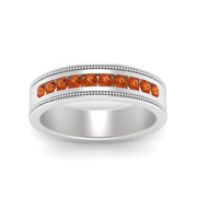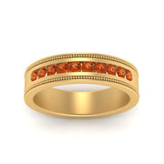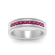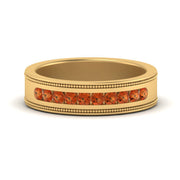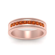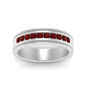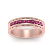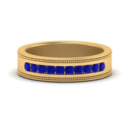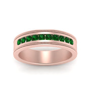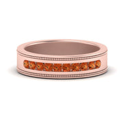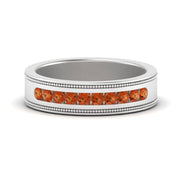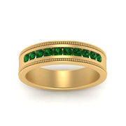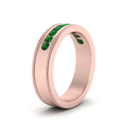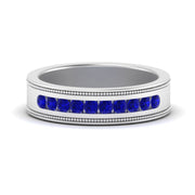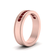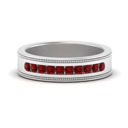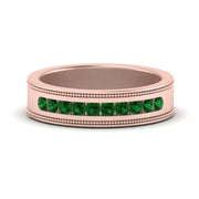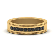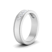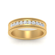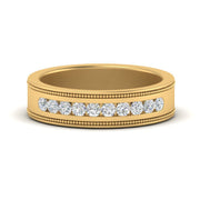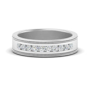 This stunning mens wedding band highlights a series of round cut diamonds beautifully encrusted in a channel setting. The shank is further decorated with a milgrain outline all over the band making it a precious symbol of love and commitment.