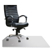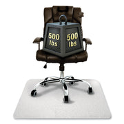 The ultimate chair mat for the heavier user. Tested to 500 lbs. Ideal for use with Big & Tall and 24 hour chairs. Extremely durable polycarbonate will not crack, curl, cup, discolor or smell and is virtually unbreakable in normal use. Easy glide ergonomic surface. Clear construction allows the beauty of flooring to shine through. Free of PVC, phthalates and all toxic chemicals. 100% recyclable and produced using 25% renewable energy. Suitable for hard floors or all pile carpets.