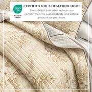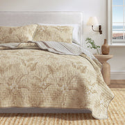 Use our chic palm leaf and bloom cotton quilt set to infuse your bedroom with tropical charm. Featuring a subtle yet playful palm leaf design, this quilt and sham set brings a hint of tropical elegance to your space without overpowering your decor. The reversible design offers a second stylish option, allowing you to refresh your look effortlessly. This quilt, crafted from natural cotton with a lightweight down alternative fill, delivers breathable softness and year-round comfort. This quilt set perfectly balances modern style and cozy practicality and adds a relaxed, sophisticated touch to your home.